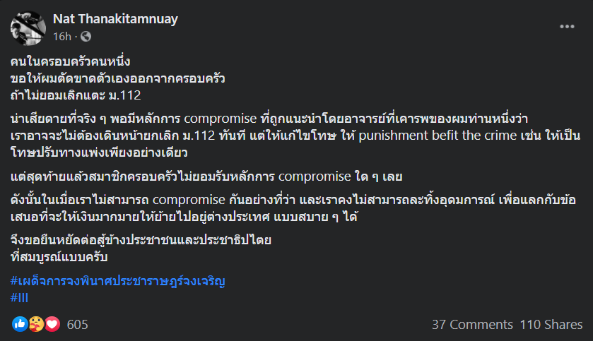 เราอาจจะไม่ต้องเดินหน้ายกเลิก ม.112 ทันที แต่ให้แก้ไขโทษ ให้ punishment befit the crime เช่น ให้เป็นโทษปรับทางแพ่งเพียงอย่างเดียว แต่สุดท้ายแล้วสมาชิกครอบครัวไม่ยอมรับหลักการ compromise ใด ๆ เลย
