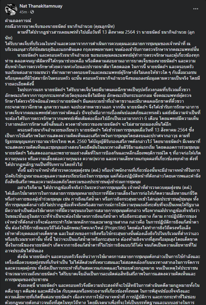 ล่าสุดเฟซบุ๊ก Nat Thanakitamnuay ของไฮโซลูกนัทได้โพสต์แถลงการณ์ในนามของครอบครัวธนากิจอำนวย เปิดเผยอาการบาดเจ็บล่าสุด โดยภายในแถลงการณ์มีรายละเอีดดังนี้