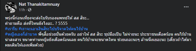 ขณะเดียวกัน ไฮโซลูกนัทได้โพสต์เฟซบุ๊คส่วนตัว หลังมีกระแสข่าวออกมาว่าตนถูกตัดขาดจากครอบครัว หลังออกมาเคลื่อนไหวต่อต้านรัฐบาล และเรียกร้องให้มีการปฏิรูปสถาบัน โดยลูกนัทยังได้ถามความคิดเห็นชาวเน็ตให้ช่วยกันตั้งนามสกุลใหม่ให้ ทั้งนี้ ไฮโซลูกนัทเปิดเผยว่า