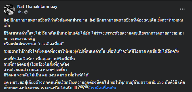 แต่ ผมจะขอสู้เคียงข้างทุกคนเพื่อเรียกร้องความถูกต้องนี้ต่อไป ขอให้ทุกคนสู้ด้วยความเข้มแข็ง สันติวิธี เพื่อ ชัยชนะของประชาชน เราจะแพ้ไม่ได้ครับ III #เราคือเพื่อนกัน
