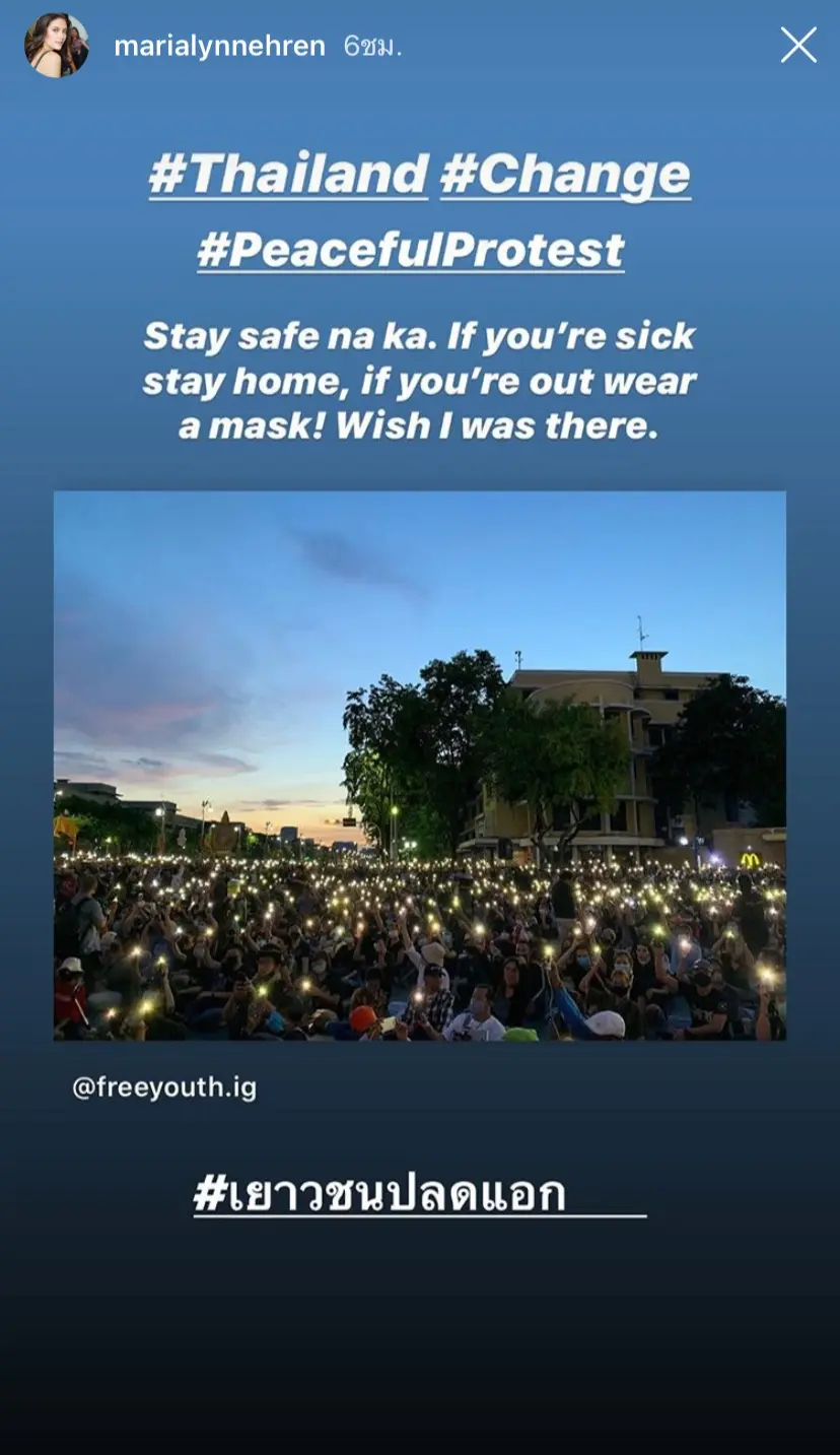 มารีญา มิสยูนิเวิร์สไทยแลนด์ 2560 ขอแสดงจุดยืน จากเหตุการณ์เมื่อวาน (18/07/63) เหล่าประชาชนและนักศึกษาได้เข้าชุมนุม เยาวชนปลดแอก ที่อนุเสาวรีย์ประชาธิปไตย เรียกร้องประชาธิปไตยและร่างรัฐธรรมนูญใหม่ โดยมีประชาชนเข้าร่วมชุมนุมเป็นจำนวนมาก