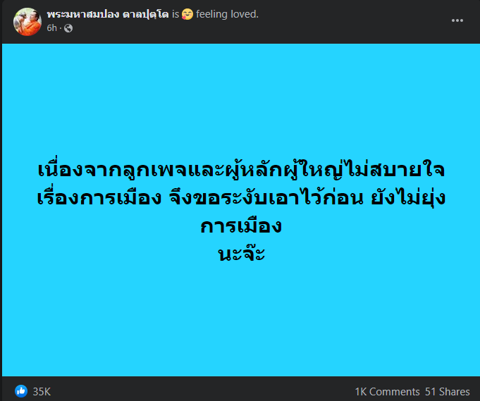 อย่างไรก็ดี ล่าสุด เมื่อวานนี้ 17 ธ.ค.2564 พระมหาสมปองได้โพสต์เฟซบุ๊ก ยืนยันว่าตนยังไม่ขอยุ่งกับการเมือง โดยระบุว่า “เนื่องจากลูกเพจและผู้หลักผู้ใหญ่ไม่สบายใจเรื่องการเมือง จึงขอระงับไว้ ยังไม่ยุ่งการเมืองนะจ๊ะ”