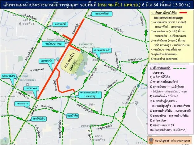เส้นทางรอบกรมทหารราบที่ 11 ขอให้หลีกเสี่ยงเส้นทางตั้งแต่เวลา 13.00 น.เป็นต้นไปจนเสร็จสิ้นการชุมนุมฯ ดังนี้