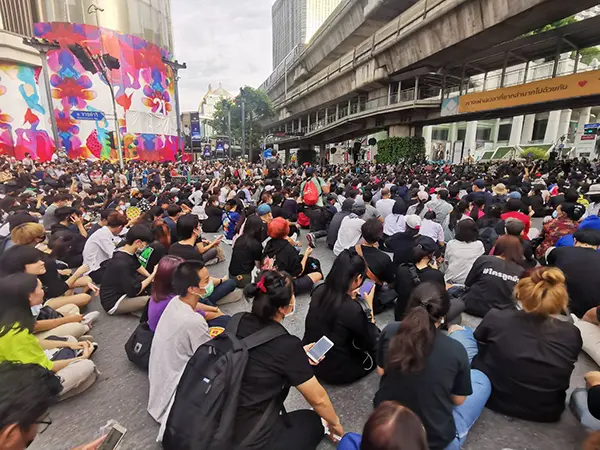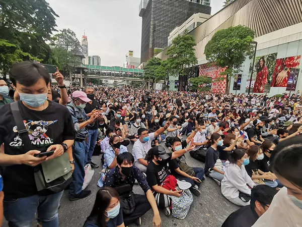 สลายชุมนุม บรรยากาศบริเวณสี่แยกราชประสงค์ ถนนราชดำริ เริ่มมีกลุ่มผู้ชุมนุมจำนวนมาก เข้ามาร่วมชุมนุมแล้วโดยใช้การเดินเท้า มาบนถนนพระราม1 เพื่อมุ่งหน้าไปยังแยกราชประสงค์ หลัง จากที่กลุ่มคณะราษฎรออกแถลงการณ์นัดหมายกลุ่มผู้ชุมนุมให้มาชุมนุมในเวลา 16.00น.โดยมีกำลังของเจ้าหน้าที่ตำรวจ ดูแลอยู่ ประกอบด้วย ฝั่งบิ๊กซีราชดำริ ตลอดจนห้างเอราวัณ, ฝั่งเซ็นทรัลเวิร์ล สยามพารากอน ไปถึงแยกเฉลิมเผ่า และบนทางเดินสกายวอร์คแนวรถไฟฟ้าทั้งหมด ห้ามกลุ่มผู้ชุมนุมขึ้นมาด้านบน เพื่อความปลอดภัย