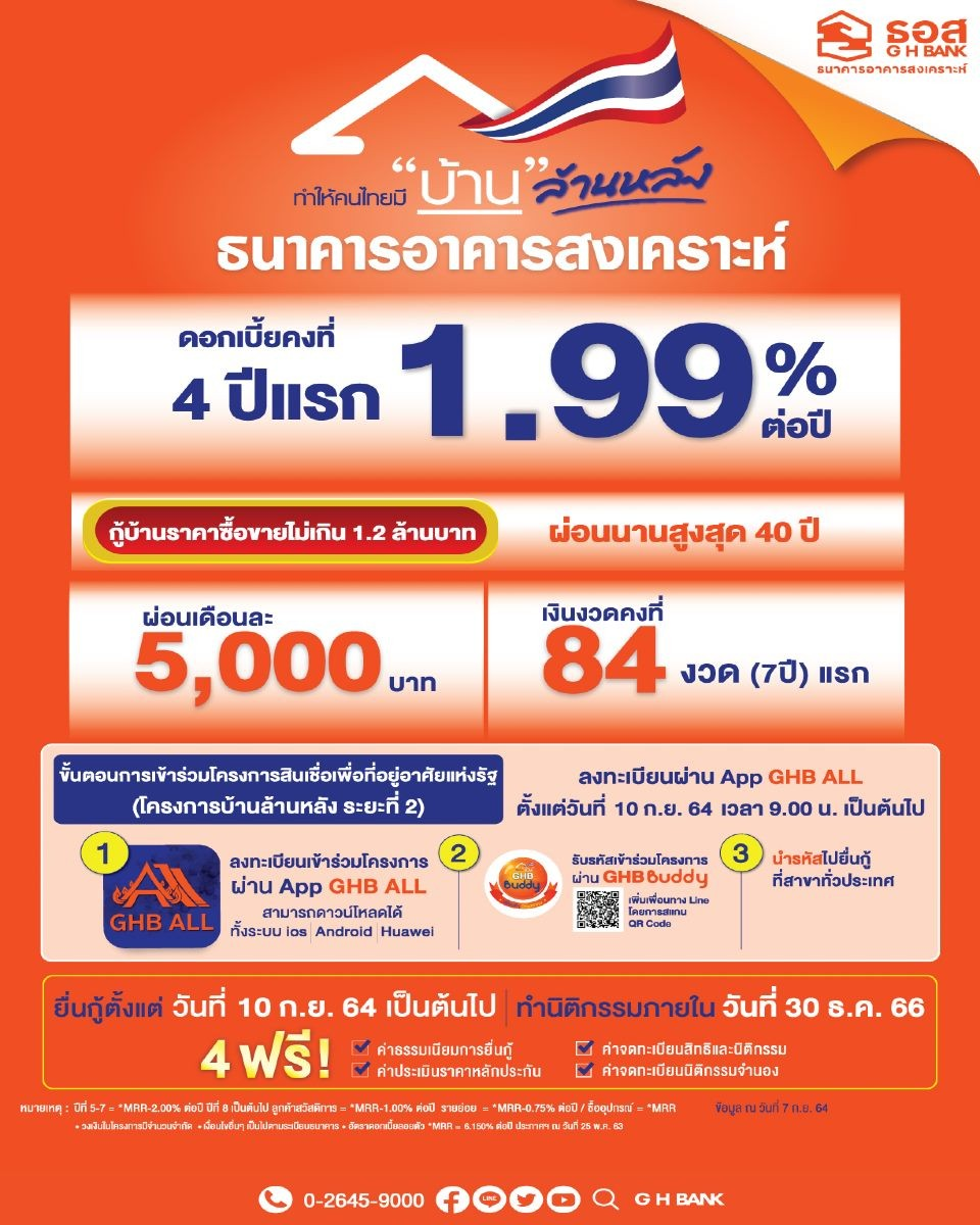 ทั้งนี้ ผู้ที่สนใจสามารถดูข้อมูลทรัพย์ NPA ที่เข้าร่วมโครงการบ้านล้านหลังได้ที่ www.ghbhomecenter.com หรือ Mobile Application : G H Bank Smart NPA และ Line Official Account : @GHB NPA