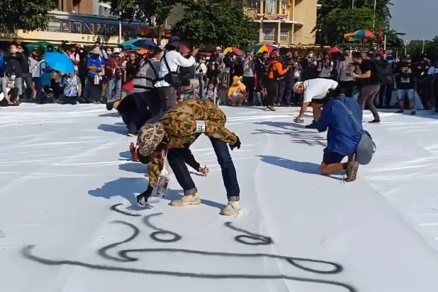 MOB FEST – วันที่ 14 พ.ย. 63 ที่อนุสาวรย์ประชาธิปไตย ขบวน นักเรียนเลว กางผ้าขาว 30×30 เมตรที่หอบหิ้วมาด้วยจากหน้ากระทรวงศึกษา ตำรวจอำนวยความสะดวกอย่างดีตลอดทาง นักเรียนระบุว่านี่เป็นกิจกรรม เขียนอนาคตด้วยมือของประชาชนเอง โดยแกนนำกล่าวว่า ความปรารถนาของประชาชนจะถูกบรรจุลงบนผืนผ้านี้