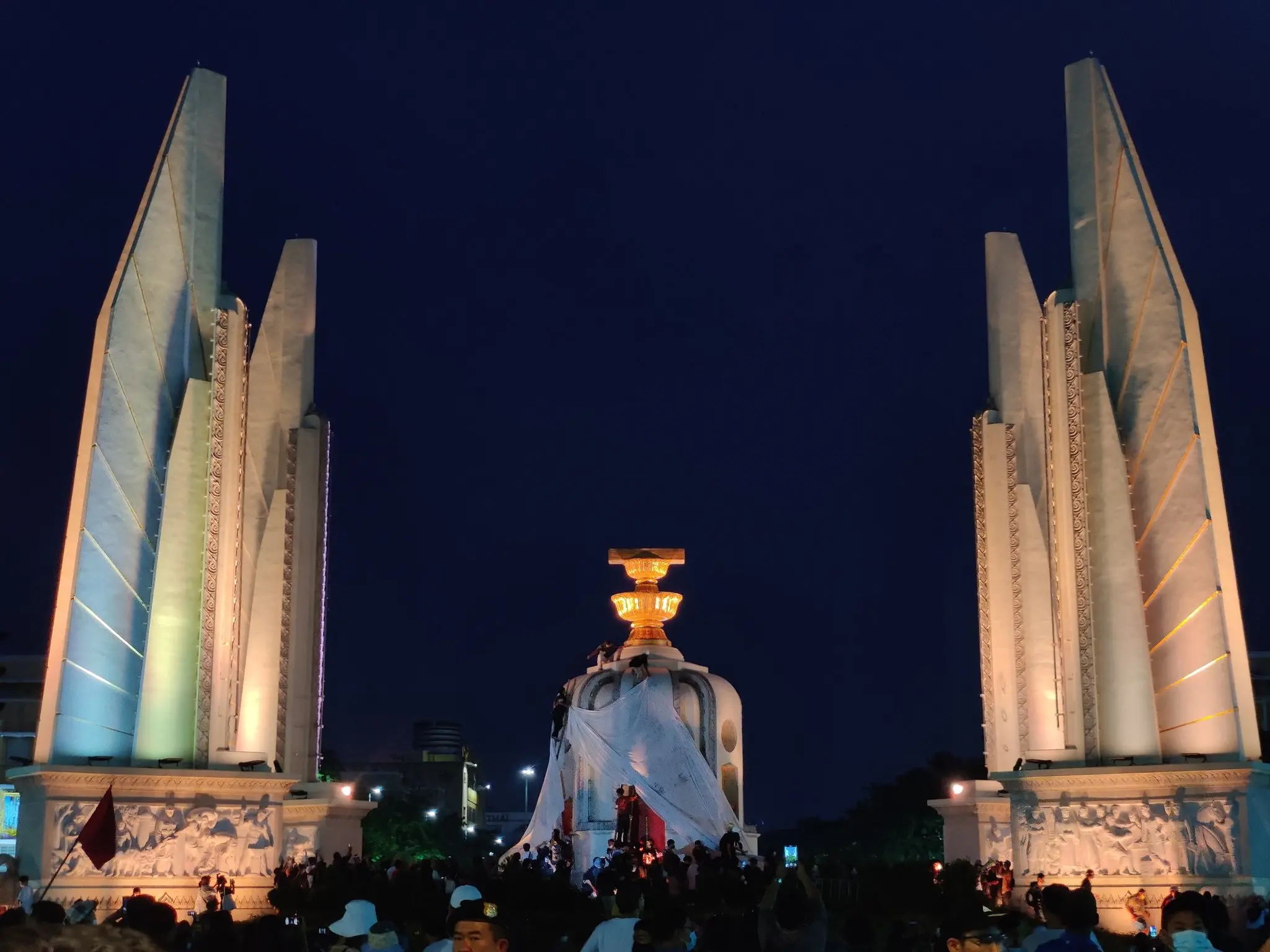 จากนั้นเวลาประมาณ 18.00 น. มวลชนได้นำผ้าที่บรรจุข้อความดังกล่าวขึ้นไปที่อนุสาวรีย์ประชาธิปไตยเพื่อเพื่อพันรอบตัวอนุสาวรีย์ไว้ ทั้งนี้มวลชนมีการเผชิญหน้ากับตำรวจควบคุมฝูงชนเล็กน้อย มีการยื้อแย่งแผงเหล็กเพื่อบุกเข้าไปในตัวอนุสาวรีย์ประชาธิปไตย
