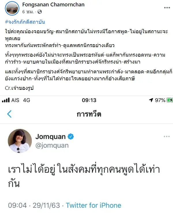ล่าสุด ฟองสนาน จามรจันทร์ อดีตนักจัดรายการวิทยุของกรมประชาสัมพันธ์ ปัจจุบันเป็นคอลัมนิสต์ ที่รู้จักกันในชื่อ “แม่หมอสมัครเล่น” โพสต์ข้อผ่านเฟซบุ๊กตอบโต้ว่า #จงรักภักดีสถาบัน ใช่ค่ะคุณน้องจอมขวัญ สมาชิกสถาบันไม่ทรงมีโอกาสพูด ไม่อยู่ในสถานะจะพูดเลย ทรงพากันก้มพระพักตร์ทำ ดูแลพสกนิกรอย่างเดียว