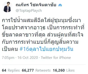 ล่าสุด ณภัทร โชคจินดาชัย หนึ่งในนักแสดงจากค่ายนาดาว ออกมาโพสต์ข้อความฉุน!! ถึงการกระทำของเจ้าหน้าที่ว่า “การใช้น้ำผสมสีฉีดใส่ผู้ชุมนุมซึ่งมาโดยปราศจากอาวุธ เป็นการกระทำที่ขี้ขลาดตาขาวที่สุด ส่วนผู้คนที่สะใจกับการกระทำแบบนี้ก็สูญสิ้นความเป็นคน #16ตุลาไปแยกปทุมวัน”