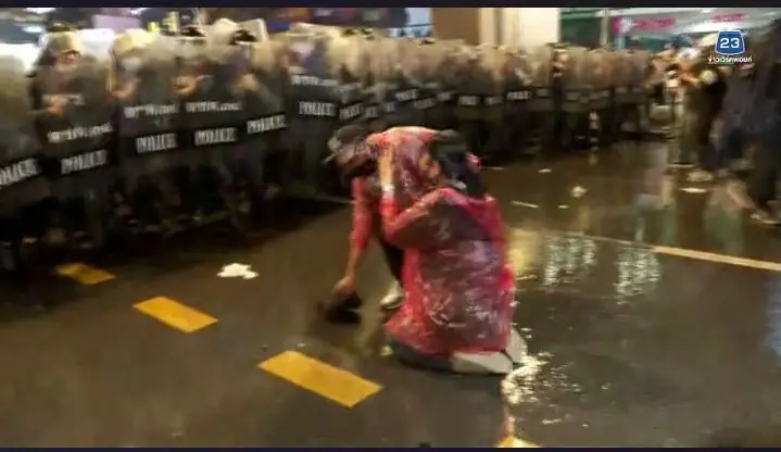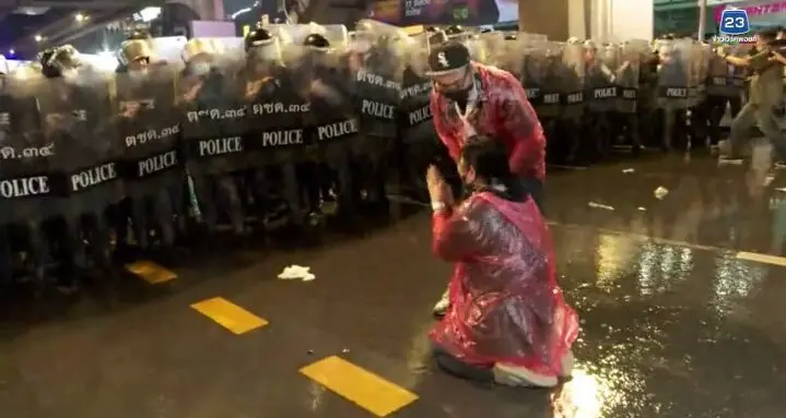 ก่อนหน้านี้ เวลา 18:50 เกิดเหตุการณ์สลายการชุมนุม “แยกประทุมวัน” เจ้าหน้าที่ทำการ สลายการชุมนุม ด้วยการใช้รถฉีดน้ำเเรงดันสูง โดยน้ำสีฟ้า มีส่วนผสมของ แก๊สน้ำตา ทำให้เกิดการระคายเคืองได้ ล่าสุด มีภาพนักศึกษาก้มกราบเจ้าหน้าที่ เพื่อร้องขอความเป็นธรรม ซึ่งเป็นภาพที่เห็นเเล้ว ประชาชนต่างรู้สึกหดหู่ต่อสถานการณ์ที่เจ้าหน้าที่สลายการชุมนุม ซึ่งในเหตุการณ์ ก็มีเเต่พลังของเด็กเเละนักศึกษาจำนวนมาก
