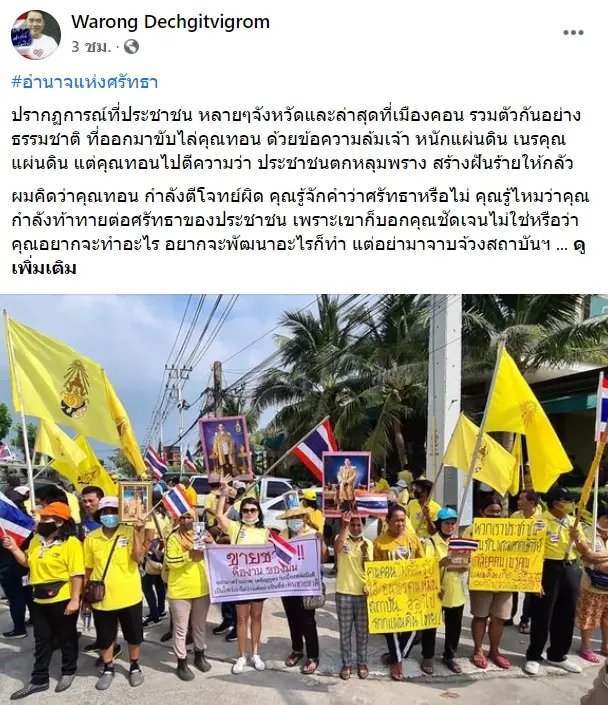ม็อบ12พ.ย. นพ.วรงค์ เดชกิจวิกรม หัวหน้ากลุ่มไทยภักดี โพสต์เฟซบุ๊ก ระบุว่า #อำนาจแห่งศรัทธาปรากฏการณ์ที่ประชาชน หลาย ๆ จังหวัดและล่าสุดที่เมืองคอน รวมตัวกันอย่างธรรมชาติ ที่ออกมาขับไล่คุณทอน ด้วยข้อความล้มเจ้า หนักแผ่นดิน เนรคุณแผ่นดิน แต่คุณทอนไปตีความว่า ประชาชนตกหลุมพราง สร้างฝันร้ายให้กลัว