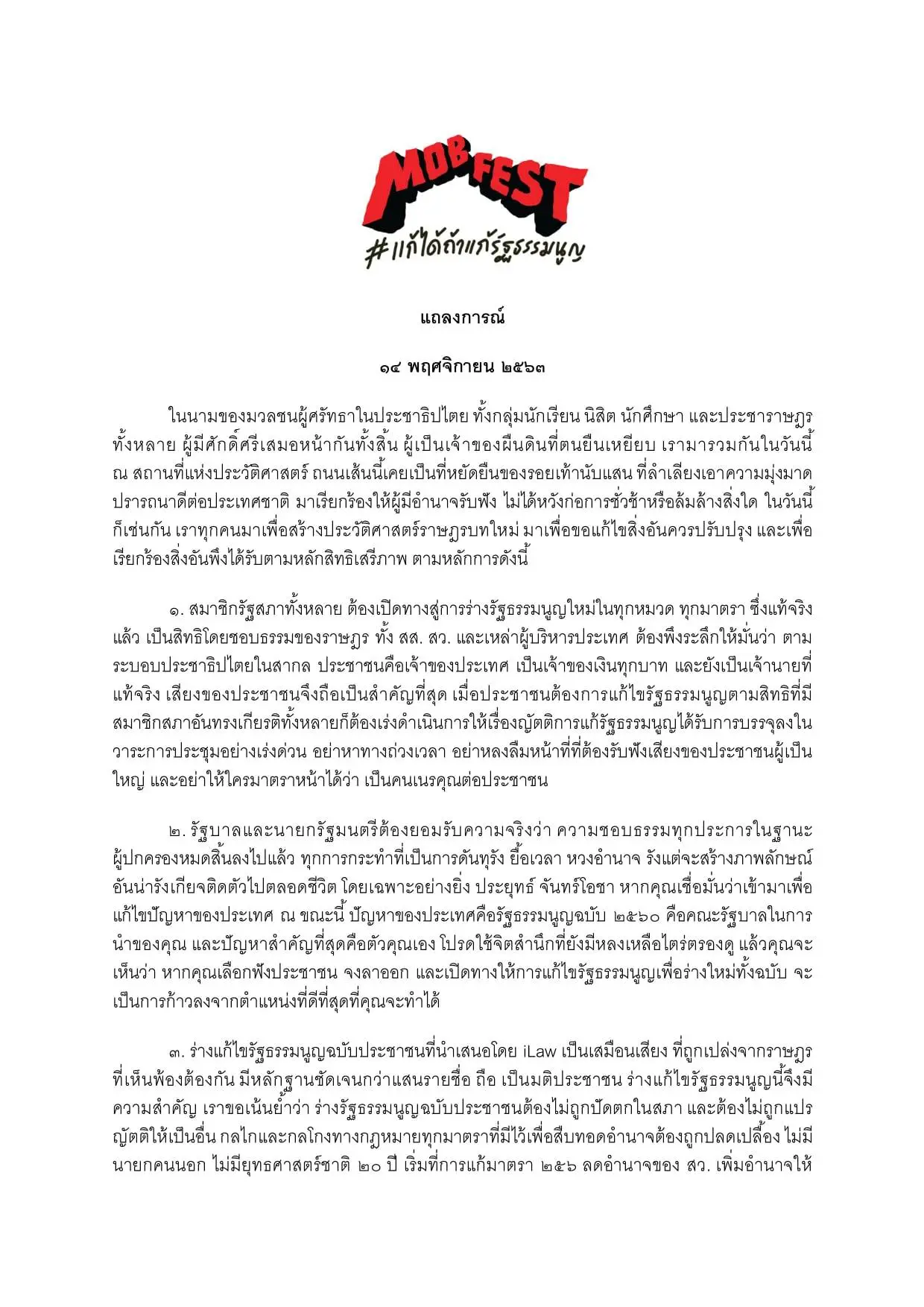 วันที่ 14 พ.ย. 63 ภาคีเครือข่ายผู้จัดงาน MOB FEST #แก้ได้ถ้าแก้รัฐธรรมนูญ แถลงยืนยัน 3 ข้อเรียกร้องหลัก ได้แก่ 1. ประยุทธ์ จันทร์โอชา และองคายพพต้องลาออก 2. ร่างรัฐธรรมนูญใหม่ 3. ปฏิรูปสถาบัน