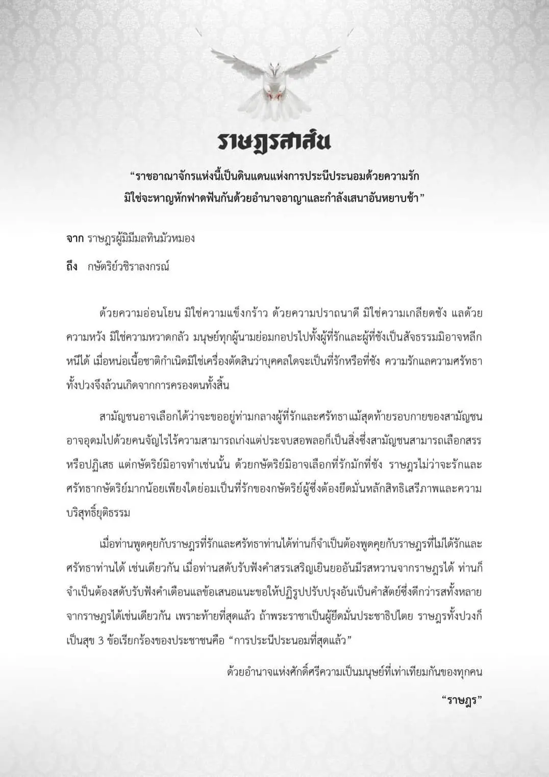ราษฎรไม่ว่าจะรักและศรัทธากษัตริย์มากน้อยเพียงใด ย่อมเป็นที่รักของกษัตริย์ ผู้ซึ่งต้องยึดมั่นหลักสิทธิเสรีภาพและความบริสุทธิ์ยุติธรรม เมื่อท่านพูดคุยกับราษฎรที่รัก และศรัทธาท่านได้ ท่านก็จำเป็นต้องพูดคุยกับราษฎรที่ไม่ได้รัก และศรัทธาท่านได้ เช่นเดียวกัน ซึ่งสถาบันเองต้องยึดหลักเสรีภาพและความยุติธรรม ดังนั้นกษัตริย์จำเป็นต้องฟังเสียงประชาชน และรับฟังข้อเรียกร้องทั้ง 3 ข้อ