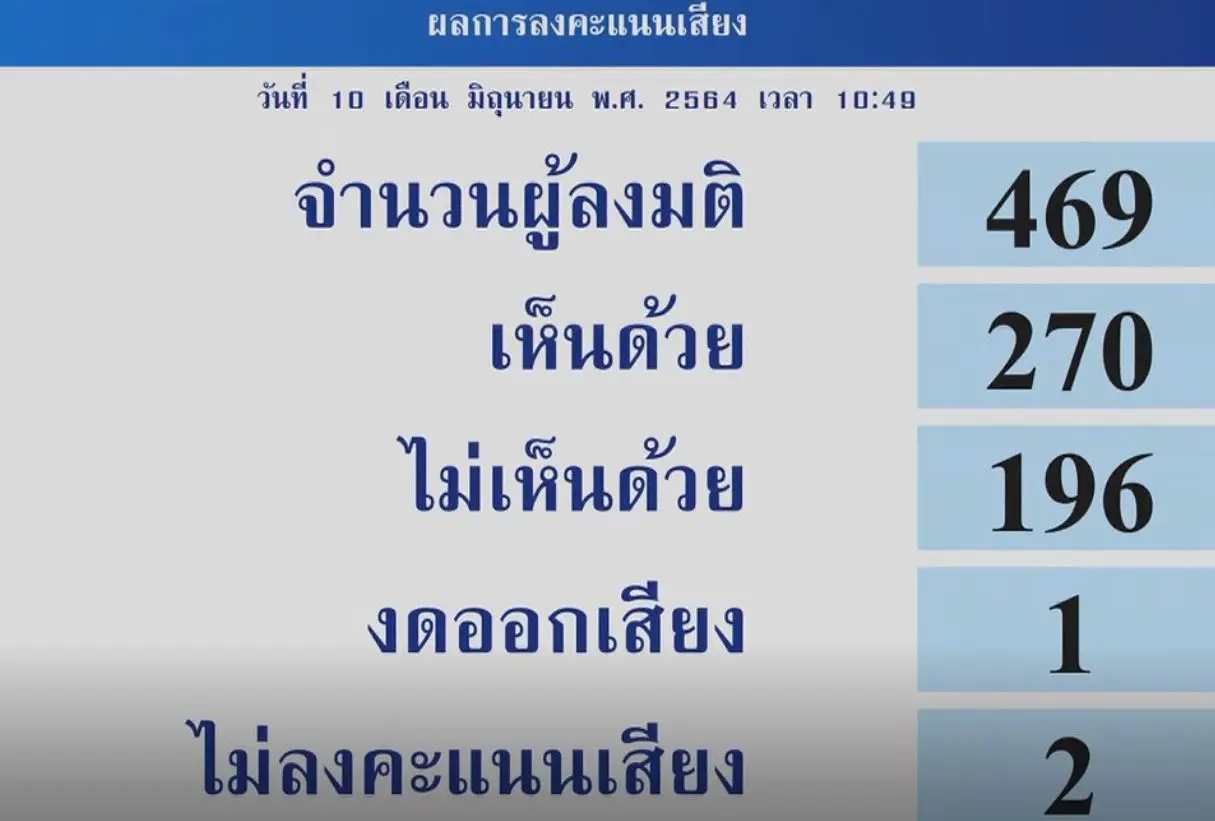 สภาฯลงมติ 270 ต่อ 196 เสียง และงดออกเสียง 1 เสียง เห็นชอบ พ.ร.ก.กู้เงิน 5 แสนล้านบาท เพื่อแก้ปัญหาสถานการณ์โควิด