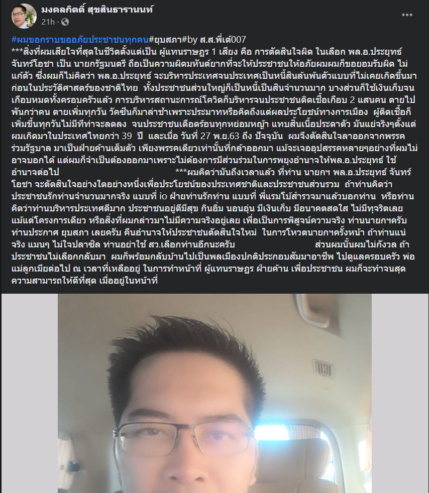 สิ่งที่ผมเสียใจที่สุดในชีวิตตั้งแต่เป็น ผู้แทนราษฎร 1 เสียง คือ การตัดสินใจผิด ในเลือก พล.อ.ประยุทธ์ จันทร์โอชา เป็น นายกรัฐมนตรี ถือเป็นความผิดมหันต์ยากที่จะให้ประชาชนให้อภัยผมผมก็ขอยอมรับผิด ไม่แก้ตัว ซึ่งผมก็ไม่คิดว่า พล.อ.ประยุทธ์ จะบริหารประเทศจนประเทศเป็นหนี้สินล้นพ้นตัวแบบที่ไม่เคยเกิดขึ้นมาก่อนในประวัติศาสตร์ของชาติไทย