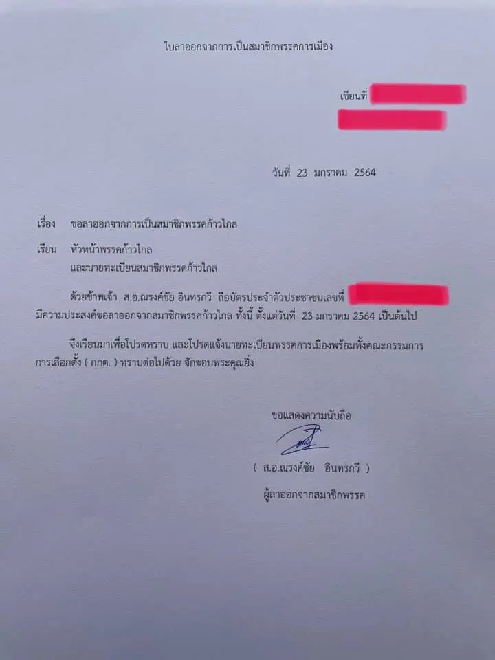 ล่าสุด หมู่อาร์มได้โพสต์ภาพหนังสือแจ้งการลาออกจากพรรคก้าวไกล บนเฟสบุ๊กส่วนตัว พร้อมกับระบุว่า