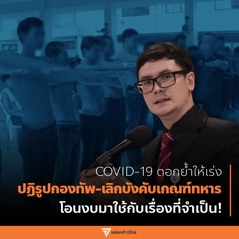 กองทัพจึงต้องทบทวนถึงสถานะของตัวเองว่ามีอะไรบ้างที่เป็นส่วนเกินที่ไม่จำเป็นต่อประเทศ และตัดมันออกไปโดยเร็วที่สุด ที่สำคัญคือต้องปรับลดอัตรากำลังพลให้เหลือเท่าที่จำเป็นต่อภารกิจทางทหารจริงๆ โดยในเบื้องต้นผมขอย้ำข้อเสนอของพรรคก้าวไกลอีกครั้งในเรื่องของการโอนงบประมาณของกระทรวงกลาโหม ทั้งโดยการงดเว้นการเกณฑ์ทหาร โอนงบประมาณจัดซื้ออาวุธ โอนงบประมาณที่ไม่เกี่ยวกับภารกิจของกองทัพโดยตรง เพื่อนำมารับมือสถานการณ์ไวรัส จัดตั้งโรงพยาบาลสนาม จัดจ้างพลเรือนอาสาสาธารณสุข ซึ่งจะต้องเกิดขึ้นโดยเร็ว และต้องให้สภาผู้แทนราษฎรมีส่วนร่วมผ่านการเปิดประชุมสมัยวิสามัญ