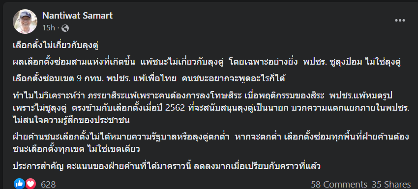 ทำไมไม่วิเคราะห์ว่า ภรรยาสิระแพ้เพราะคนต้องการลงโทษสิระ เบื่อพฤติกรรมของสิระ พปชร.แพ้หมดรูป เพราะไม่ชูลุงตู่ ตรงข้ามกับเลือกตั้งเมื่อปี 2562 ที่จะสนับสนุนลุงตู่เป็นนายก บวกความแตกแยกภายในพปชร. ไม่สนใจความรู้สึกของประชาชน