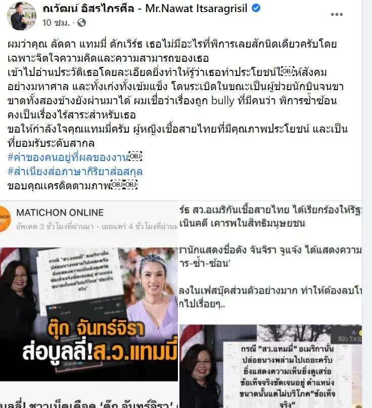 จากนั้น จันทร์จิรา จูแจ้ง ผู้จัดการรายและอดีตนางเอกละครชื่อดัง ได้แสดงความคิดเห็นว่า พิการซ้ำซ้อน!! ในโพสต์ของผู้ใช้เฟซบุ๊กรายหนึ่ง ที่ระบุว่า “สว.แทมมี่” อเมริกานั่น ปล่อยนางพล่ามไปเถอะครับ ยิ่งแสดงความเห็นยิ่งดูเสร่อ ข้อเท็จจริงชัดเจนอยู่ ตำแหน่งขนาดนั้นแต่ไม่บริโภค “ข้อเท็จจริง”