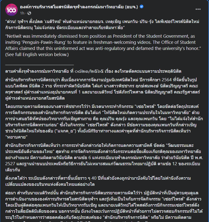 เนติวิทย์ — เมื่อวันที่ 26 ก.พ. 2565 เฟซบุ๊กองค์การบริหารสโมสรนิสิตจุฬาลงกรณ์มหาวิทยาลัย (อบจ.) ได้โพสต์ข้อความระบุว่า “ตามคำสั่งจุฬาลงกรณ์มหาวิทยาลัย ที่ ๐๘๒๑/๒๕๖๕ เรื่อง ลงโทษตัดคะแนนความประพฤตินิสิต
