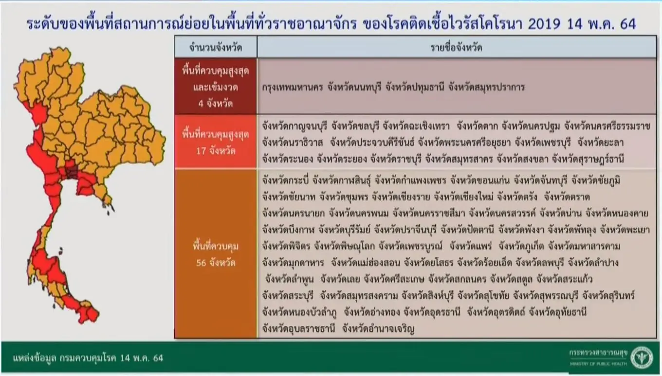พื้นที่สีแดงเข้ม — เมื่อวันนี้ (15 พ.ค.) นพ.ทวีศิลป์ วิษณุโยธิน โฆษก ศบค.ได้แถลงข่าวสถานการณ์การแพร่ระบาดของโควิด19 ประจำวัน โดยระบุว่าขณะนี้ ที่ประชุม ศบค. ได้มีมติเห็นชอบให้ปรับระดับของพื้นที่สถานการณ์ย่อยในพื้นที่ทั่วราชอาณาจักร ดังนี้