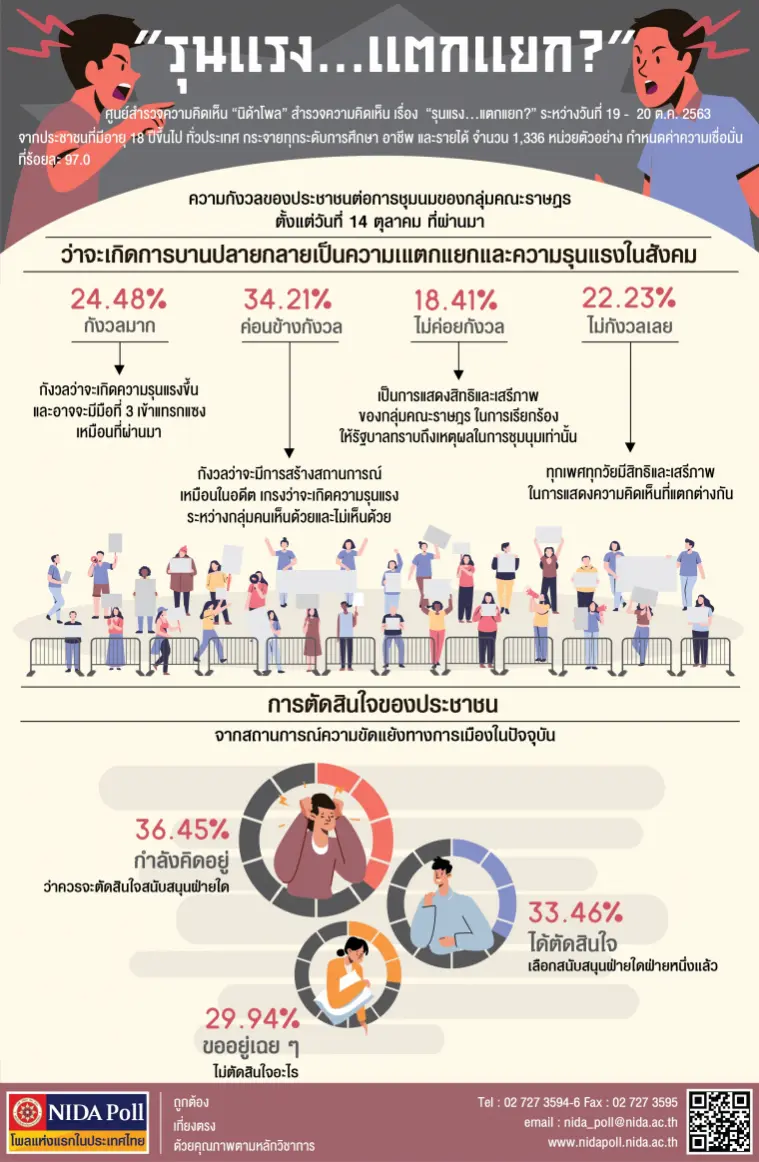 ศูนย์สำรวจความคิดเห็น นิด้าโพล สถาบันบัณฑิตพัฒนบริหารศาสตร์ (นิด้า) เปิดเผยผลสำรวจของประชาชน เรื่อง รุนแรงแตกแยก ทำการสำรวจระหว่างวันที่ 19 – 20 ตุลาคม 2563 จากประชาชนที่มีอายุ 18 ปีขึ้นไป กระจายทุกภูมิภาค ระดับการศึกษา และอาชีพทั่วประเทศ รวมทั้งสิ้น จำนวน 1,336 หน่วยตัวอย่าง เกี่ยวกับการการชุมนุมของกลุ่มคณะราษฎร ตั้งแต่วันที่ 14 ตุลาคม ที่ผ่านมา การสำรวจอาศัยการสุ่มตัวอย่าง โดยใช้ความน่าจะเป็นจากบัญชีรายชื่อฐานข้อมูลตัวอย่างหลัก (Master Sample) ของ “นิด้าโพล” สุ่มตัวอย่างด้วยวิธีแบบง่าย (Simple Random Sampling) เก็บข้อมูลด้วยวิธีการสัมภาษณ์ทางโทรศัพท์โดยกำหนดค่าความเชื่อมั่นที่ร้อยละ 97.0