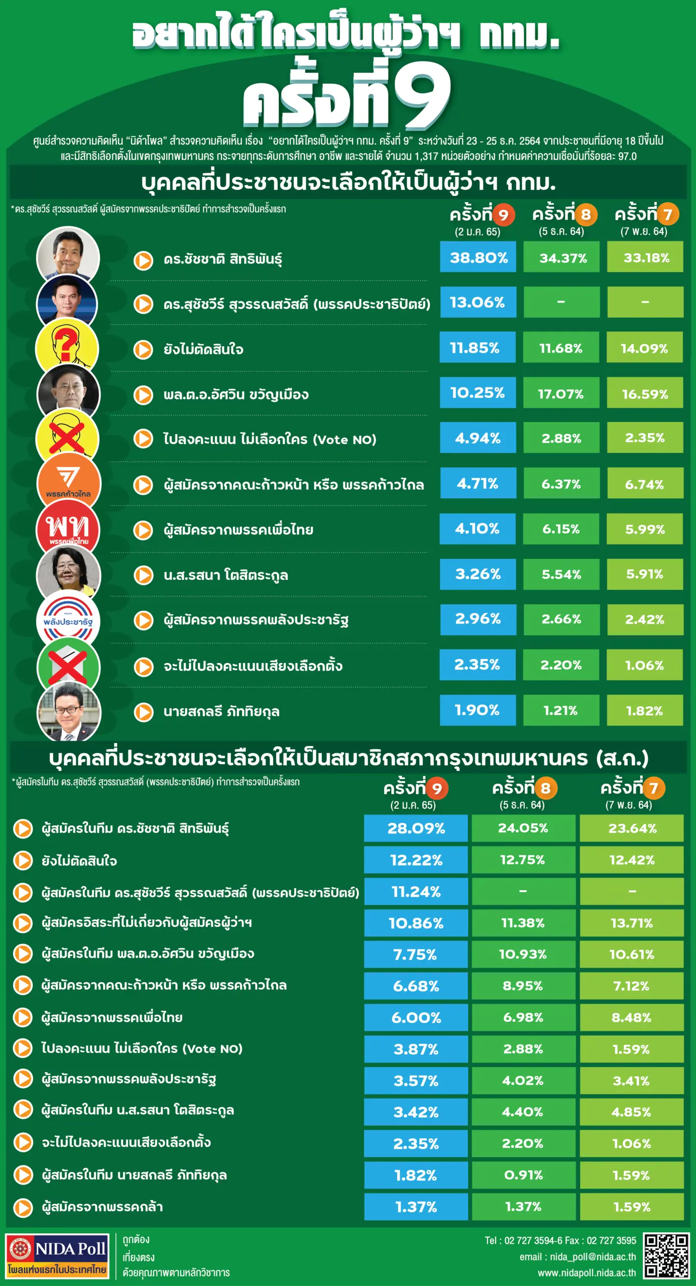 ศูนย์สำรวจความคิดเห็น นิด้าโพล สำรวจความคิดเห็น เรื่องอยากได้ใครเป็นผู้ว่าฯ กทม. ครั้งที่9 ระหว่างวันที่ 23 – 25 ธันวาคม 2564 จากประชาชนที่มีอายุ 18 ปีขึ้นไปและมีสิทธิเลือกตั้งในเขตกรุงเทพมหานคร กระจายทุกระดับการศึกษา อาชีพ และรายได้ จำนวน 1,317 หน่วยตัวอย่าง กำหนดค่าความเชื่อมั่นที่ร้อยละ 97.0