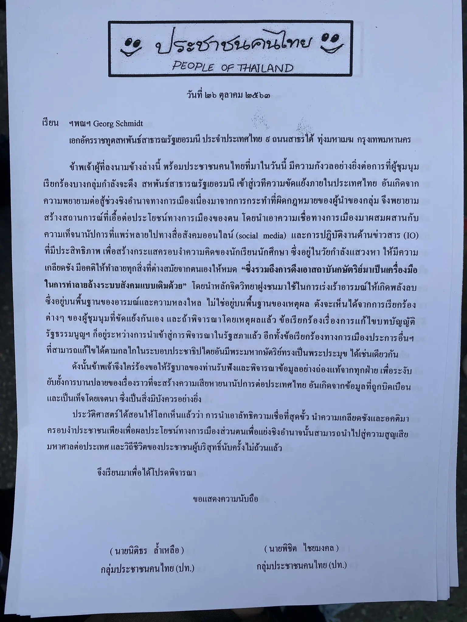ทางกลุ่มประชาชนคนไทยจึงอยากให้รัฐบาลเยอรมนีรับฟัง และพิจารณาข้อมูลทุกอย่างจากทุกฝ่ายเพื่อยับยั้งความเสียหายที่อาจเกิดขึ้นกับประเทศไทย ที่เกิดจากการบิดเบือนและเป็นเท็จ
