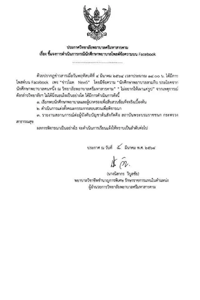 ต่อมาวิทยาลัยพยาบาลศรีมหาสารคาม ได้ออกประกาศชี้แจงถึงเหตุการณ์ดังในต่อมาว่า ทางวิทยาลัยฯ ไม่ได้นิ่งนอนใจเป็นอย่างใจเป็นอย่างใด ได้มีการดำเนินการดังนี้