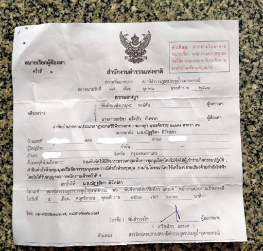 ฉะนั้นให้ : นางสาวณัฐธิดา มีวังปลา ไป ณ ที่ สถานีตำรวจภูธรประตูน้ำจุฬาลงกรณ์ พบ พันตำรวจโทเกรียงไกร แสงยศ เจ้าหน้าที่สอบสวนเจ้าของคดีในวันที่ 5 พฤศจิกายน 2563 เวลา 9:00 น เบอร์โทร 02-959-3202-7,085- 927-6063