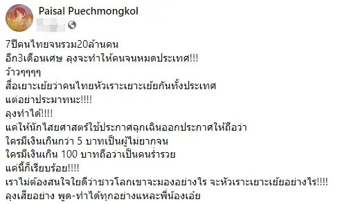 “7 ปี คนไทยจนรวม 20 ล้านคน อีก 3 เดือนเศษ ลุงจะทำให้คนจนหมดประเทศ ว้าวๆๆๆๆ สื่อเยาะเย้ยว่าคนไทยหัวเราะเยาะเย้ยกันทั้งประเทศ