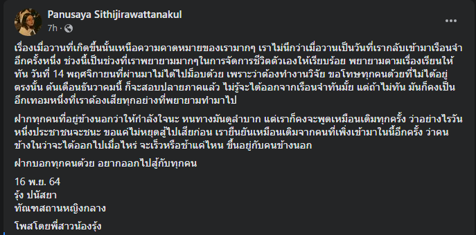ล่าสุด เมื่อวันที่ 16 พ.ย.2564 เฟซบุ๊กของรุ้ง ปนัสยาได้โพสต์ข้อความ เปิดเผยความรู้สึก หลังจากที่ตนต้องกลับเข้าไปในเรือนจำอีกรอบ โดยระบุว่า
