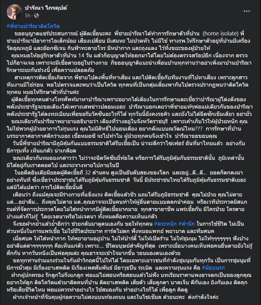 น.ส. ปารีณา ไกรคุปต์ ส.ส.ราชบุรี พรรคพลังประชารัฐ ได้โพสต์เฟซบุ๊คในวันนี้(19 ส.ค.2564)เปิดเผยว่า พี่ชายของตนติดเชื้อโควิด19 พร้อมกับได้แบ่งปันประสบการณ์การรักษาตัวที่บ้านของพี่ชาย โดยมีรายละเอียดดังนี้