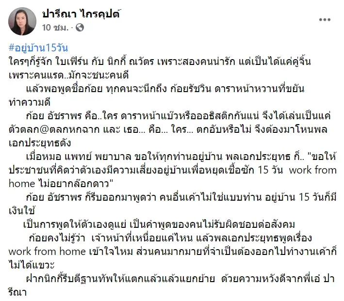ก้อย คงไม่รู้ว่า เจ้าหน้าที่เหนื่อยแค่ไหน แล้วพลเอกประยุทธพูดเรื่อง work from home เข้าใจไหม ส่วนคนมากมายที่จำเป็นต้องออกไปทำงานเค้าก็ไม่ได้แขวะ ฝากนิกกี้รีบตีฐานทัพให้แตกแล้วแล้วแยกย้าย ด้วยความหวังดีจากพี่เอ๋ ปารีณา