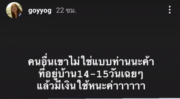 ก้อย อัชราพร ก็รีบออกมาพูดว่า คนอื่นเค้าไม่ใช่แบบท่าน อยู่บ้าน 15 วันก็มีเงินใช้ เป็นการพูดให้ตัวเองดูแย่ เป็นคำพูดของคนไม่รับผิดชอบต่อสังคม