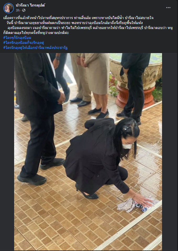 เมื่อวันที่ 22 ก.ย. 2564 น.ส. ปารีณา ไกรคุปต์ ส.ส.ราชบุรี พรรคพลังประชารัฐได้โพสต์ภาพของตนขณะนั่งก้มเช็ดน้ำบนทางบันไดลงในเฟซบุ๊กส่วนตัว ภายหลังลงพื้นที่กับ พล.อ.ประวิตร วงษ์สุวรรณ รองนายกรัฐมนตรีและหัวหน้าพรรคพลังประชารัฐ ในการลงพื้นที่ติดตามสถานการณ์น้ำที่คลองส่งน้ำและบำรุงรักษาบางบาล จ.พระนครศรีอยุธยา ซึ่งในเวลานั้นได้มีฝนตกลงมาอย่างหนัก จนทำให้พื้นทางเดินตรงบันไดเปียก โดยน.ส. ปารีณาเขียนบรรยายในโพสต์ดังกล่าวว่า