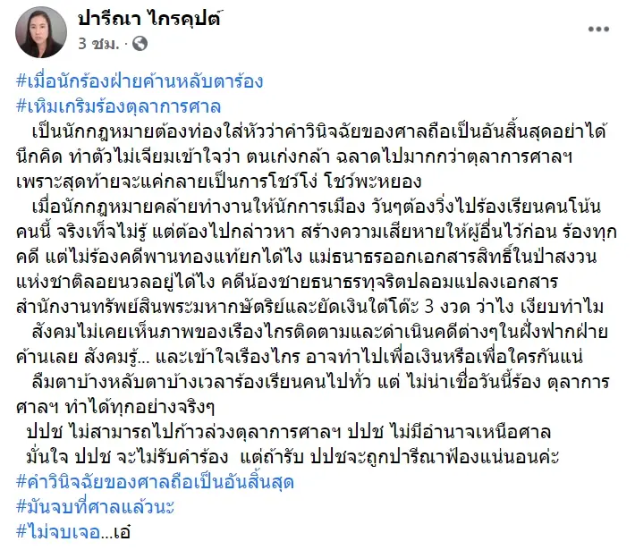 ล่าสุด น.ส.ปารีณา ไกรคุปต์ ส.ส.ราชบุรี พรรคพลังประชารัฐ โพสต์ข้อความผ่านเฟซบุ๊ก ระบุว่า เมื่อนักร้องฝ่ายค้านหลับตาร้อง เหิมเกริมร้องตุลาการศาล เป็นนักกฎหมายต้องท่องใส่หัวว่าคำวินิจฉัยของศาลถือเป็นอันสิ้นสุดอย่าได้นึกคิด ทำตัวไม่เจียมเข้าใจว่า ตนเก่งกล้า ฉลาดไปมากกว่าตุลาการศาลฯ เพราะสุดท้ายจะแค่กลายเป็นการโชว์โง่ โชว์พะหยอง