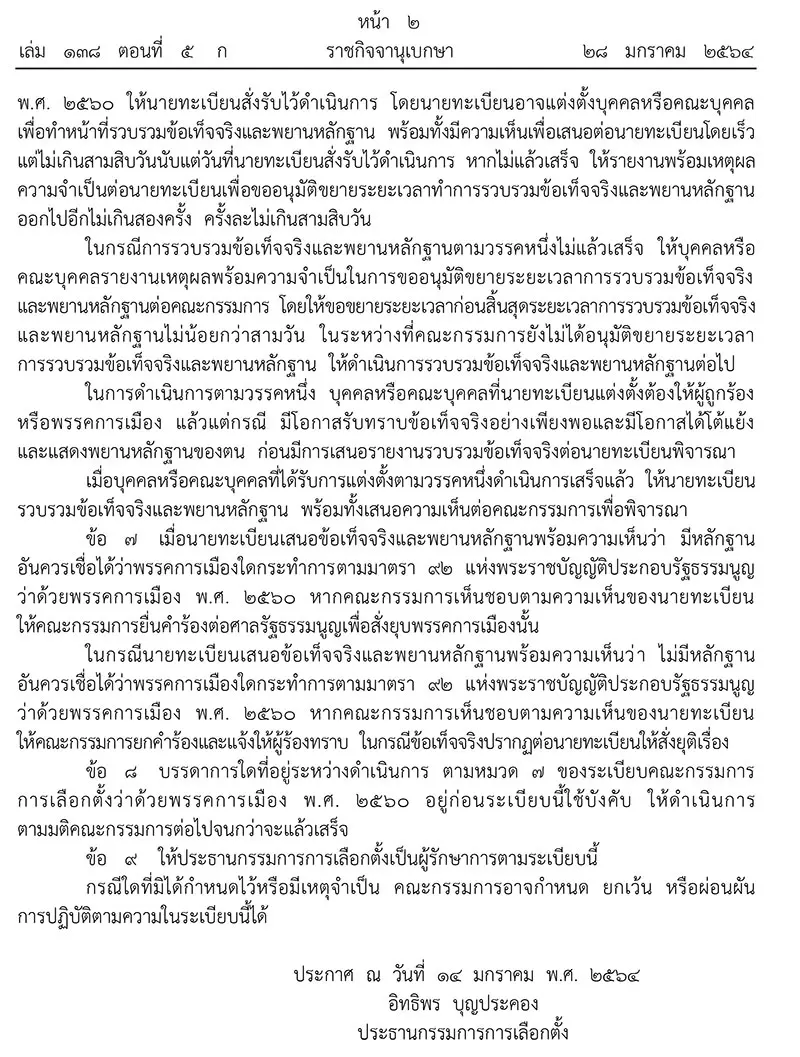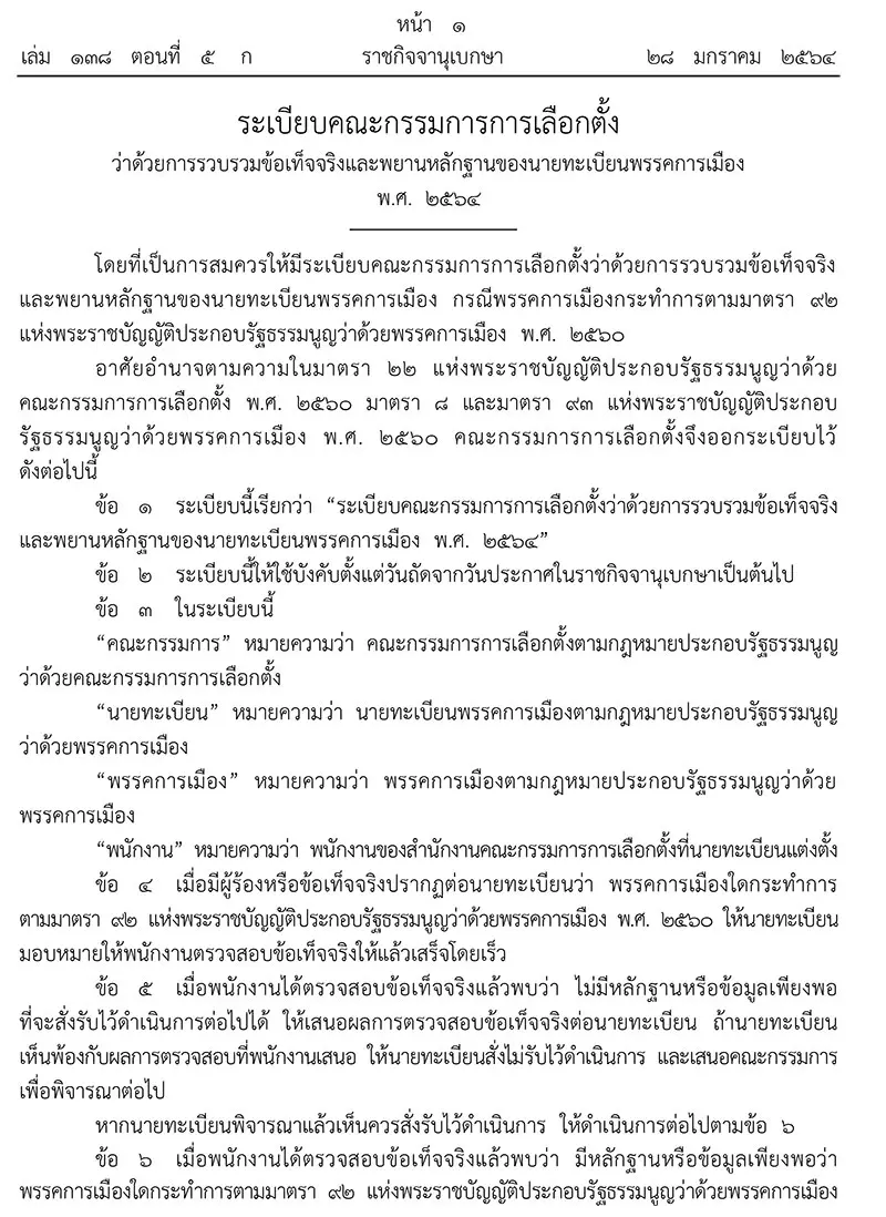 ราชกิจจานุเบกษา เผยแพร่ ระเบียบคณะกรรมการการเลือกตั้งว่าด้วยการรวบรวมข้อเท็จจริง และพยานหลักฐานของนายทะเบียนพรรคการเมืองพ.ศ. 2564