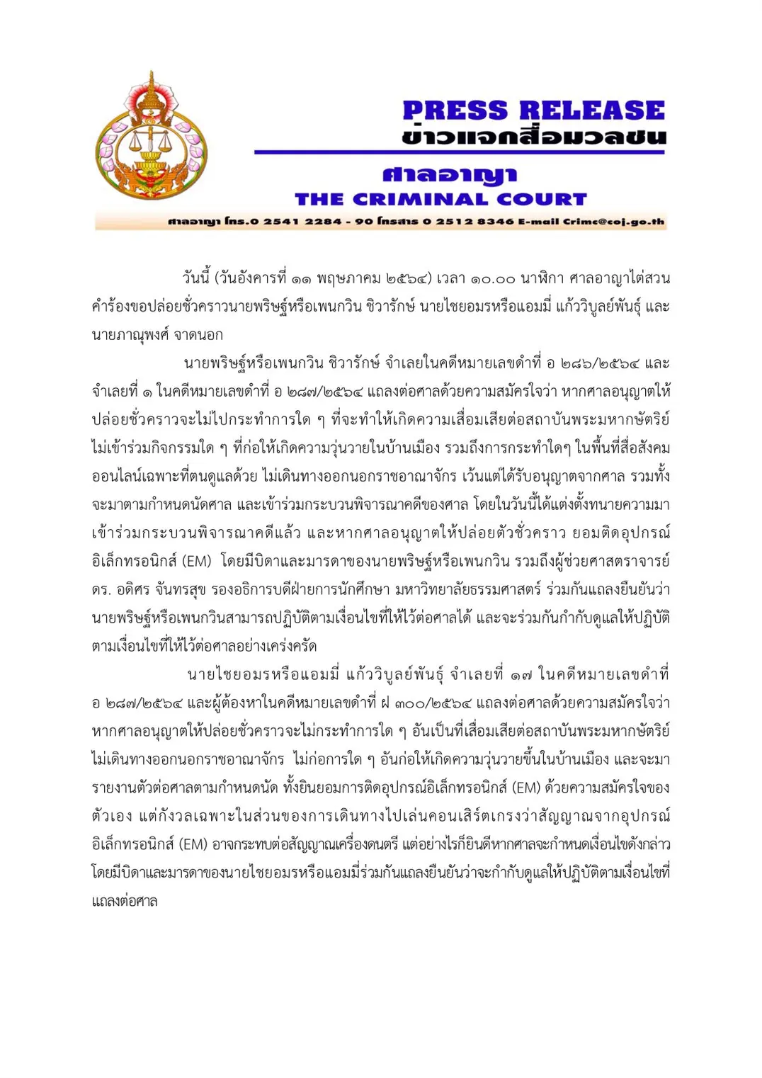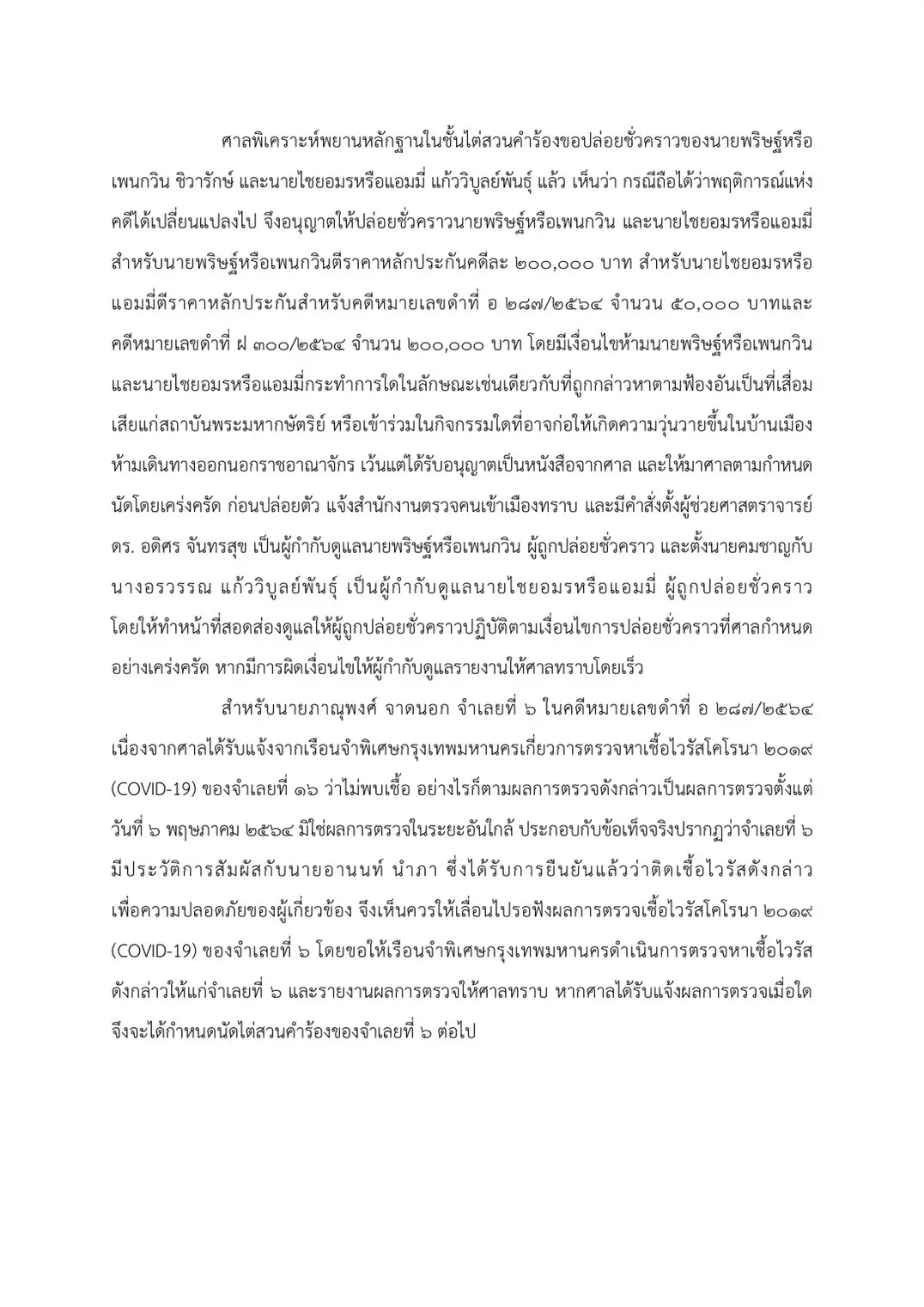 โดยศาลได้กำหนดเงื่อนไขในการปล่อยตัวคือ ห้ามกระทำการใดที่เป็นการเสื่อมเสียต่อสถาบันฯ ไม่เดินทางออกนอกประเทศเว้นแต่ได้รับอนุญาตจากศาล ไม่เข้าร่วมกิจกรรมใดๆ ที่อาจจะก่อให้เกิดความวุ่นวายในบ้านเมืองด้วย ต้องเดินทางมาศาลทุกนัด และยินยอมให้ติดอุปกรณ์ติดตามตัว โดยจำเลยทั้ง 2 ได้ยอมรับเงื่อนไขทั้งหมด ซึ่งศาลจะปล่อยตัวจากเรือนจำในวันนี้