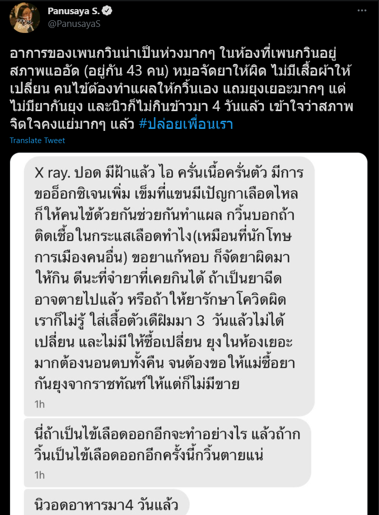 ทั้งนี้ รุ้ง ปนัสยาได้เปิดเผยถึงอาการล่าสุดของเพนกวินว่า อาการของเพนกวินน่าเป็นห่วงมากๆ ในห้องที่เพนกวินอยู่สภาพแออัด (อยู่กัน 43 คน) หมอจัดยาให้ผิด ไม่มีเสื้อผ้าให้เปลี่ยน คนไข้ต้องทำแผลให้กวิ้นเอง แถมยุงเยอะมากๆ แต่ไม่มียากันยุง และนิวก็ไม่กินข้าวมา 4 วันแล้ว เข้าใจว่าสภาพจิตใจคงแย่มากๆ แล้ว #ปล่อยเพื่อนเรา