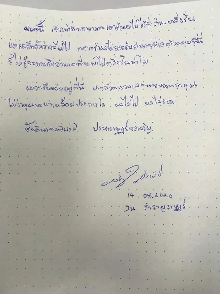 นายพริษฐ์ ชิวารักษ์ หรือ เพนกวิน นักศึกษามหาวิทยาลัยธรรมศาสตร์ และแกนนำเยาวชนปลดแอกได้โพสต์จดหมาย ซึ่งเขียนด้วยลายมือลงใน เฟสบุ๊กของของตน หลังจากที่ถูกตำรวจเข้าจับกุม และถูกควบคุมตัวไว้ที่สน.สำราษราษฎร์เมื่อคืนที่ผ่านมา โดยในจดหมายมีข้อความระบุว่า
