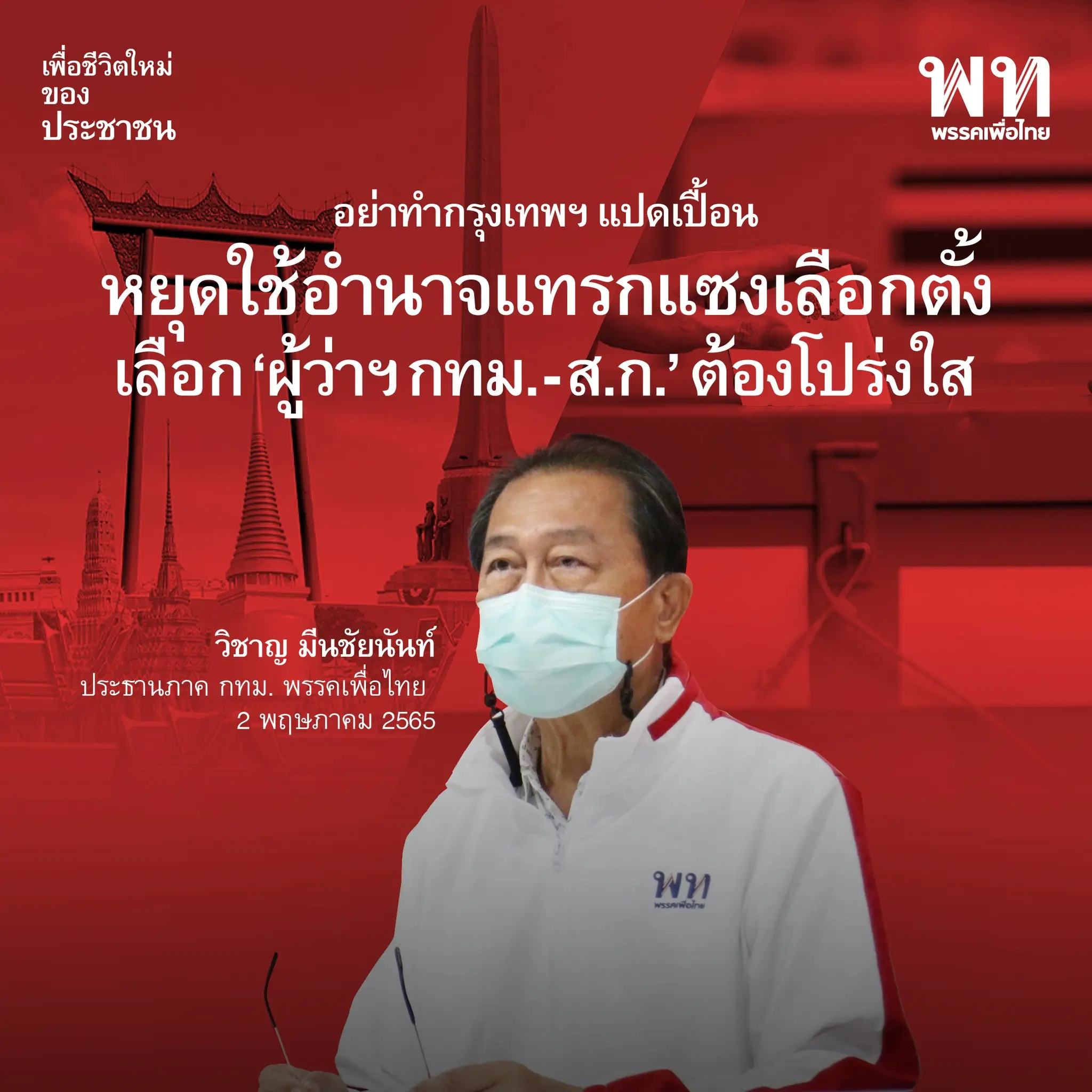 โดยที่ผ่านมา พรรคเพื่อไทยได้ติดตามและตรวจสอบสถานการณ์การเลือกตั้งท้องถิ่นของกรุงเทพฯ มาโดยตลอดพบพฤติกรรมการเตรียมเก็บรายชื่อประชาชนในหลายพื้นที่ ไปจนถึงการข่มขู่คู่แข่ง ตลอดจนพฤติกรรมของข้าราชการบางหน่วยงานที่ส่อถึงความไม่เป็นกลางทางการเมืองหรือบางแห่งส่อว่าจะเกิดการใช้อำนาจรัฐแทรกแซงการเลือกตั้ง จึงขอเรียกร้องให้ผู้มีอำนาจประกาศให้ชัดเจนว่า จะไม่ใช้อำนาจในการแทรกแซงการเลือกตั้งท้องถิ่น และหากมีการเอื้อประโยชน์เกิดขึ้นก็ต้องพร้อมแสดงความรับผิดชอบ