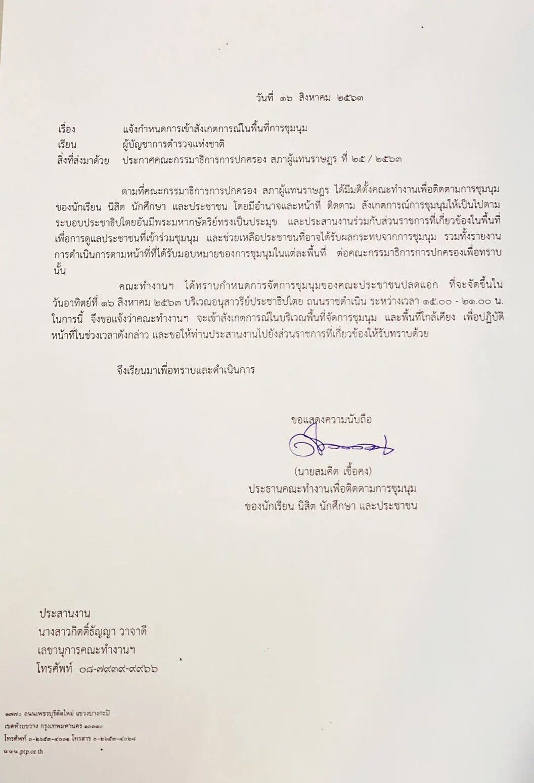 โดย เพจพรรคเพื่อไทย ได้โพสต์เฟซบุ๊ก การชุมครั้งนี้ จะมีคณะทำงานเพื่อติดตามการชุมนุมของนักเรียน นิสิต นักศึกษาและประชาชน