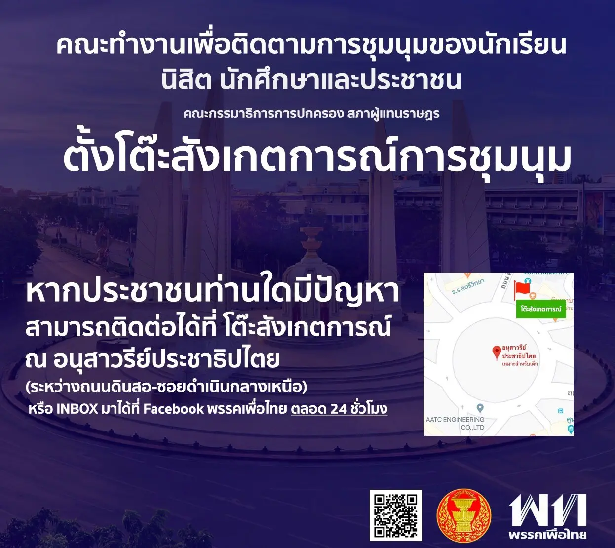 หากประชาชนท่านใดมีปัญหา สามารถติดต่อได้ที่ โต๊ะสังเกตการณ์ ณ อนุสาวรีย์ประชาธิปไตย (ระหว่างถนนดินสอ-ซอยดำเนินกลางเหนือ) หรือ INBOX มาได้ที่ Facebook พรรคเพื่อไทย ตลอด 24 ชั่วโมง