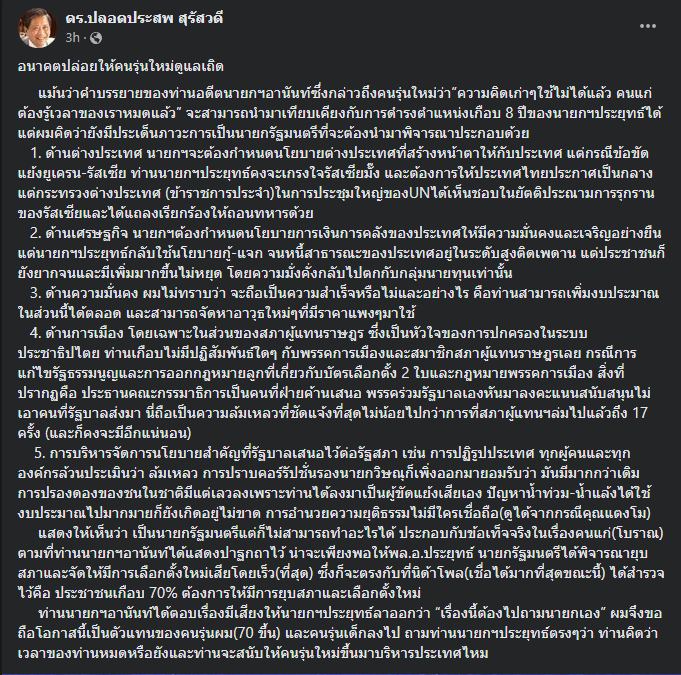 ท่านนายกฯอานันท์ได้ตอบเรื่องมีเสียงให้นายกฯประยุทธ์ลาออกว่า “เรื่องนี้ต้องไปถามนายกเอง” ผมจึงขอถือโอกาสนี้เป็นตัวแทนของคนรุ่นผม(70 ขึ้น) และคนรุ่นเด็กลงไป ถามท่านนายกฯประยุทธ์ตรงๆว่า ท่านคิดว่า เวลาของท่านหมดหรือยังและท่านจะสนับให้คนรุ่นใหม่ขึ้นมาบริหารประเทศไหม”