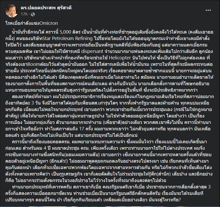 สภาล่ม — เมื่อวันที่ 12 ก.พ. 2565 นายปลอดประสพ สุรัสวดี อดีตรองนายกรัฐมนตรีและแกนนำพรรคเพื่อไทยได้โพสต์ข้อความผ่านทางเฟซบุ๊กส่วนตัว ในหัวข้อ “โรคเบื่อกำลังแซง Omicron” เพื่อแสดงความคิดเห็นเรื่องปัญหาคราบน้ำมันรั่วที่จังหวัดระยอง และเรื่องสภาล่ม โดยระบุว่า