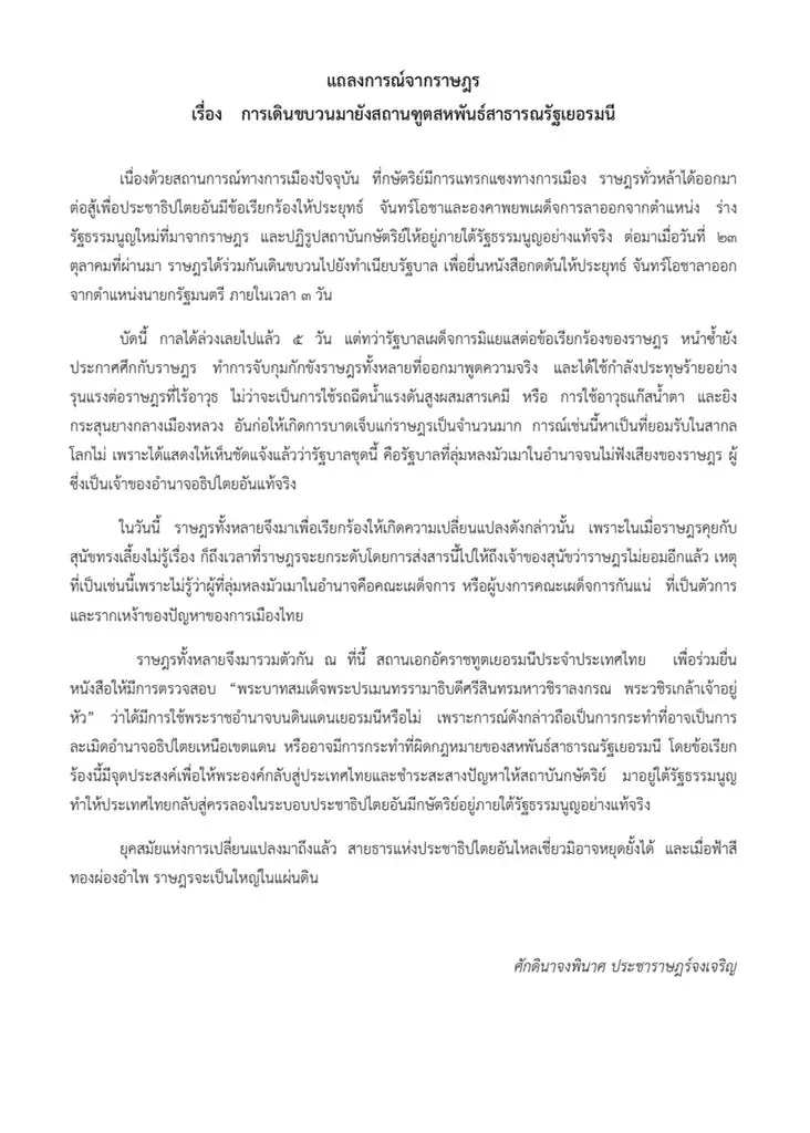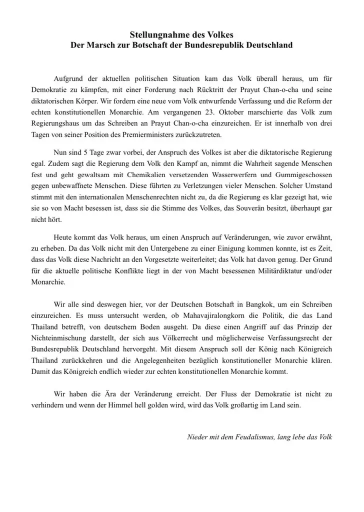 กลุ่ม ราษฎร ซึ่งนำโดยน.ส.ภัสราวลี ธนกิจวิบูลย์ผล หรือมายด์ กลุ่มมหานครเพื่อประชาธิปไตย, นายจตุภัทร์ บุญภัทรรักษา หรือไผ่ ดาวดิน และนายแพทริค แมคเบลนได้เป็นตัวแทนของกลุ่มเข้ายื่นหนังสือต่อตัวแทนสถานทูตเยอรมนี พร้อมกับอ่านแถลงการณ์ 3 ภาษา ทั้งภาษาไทย อังกฤษ และเยอรมนี