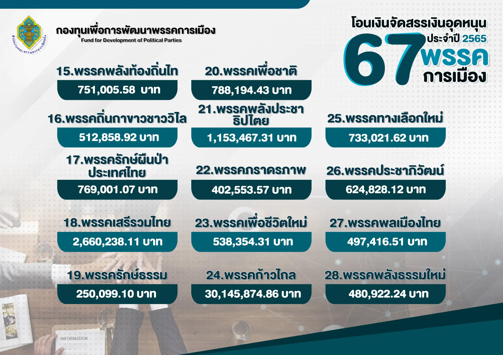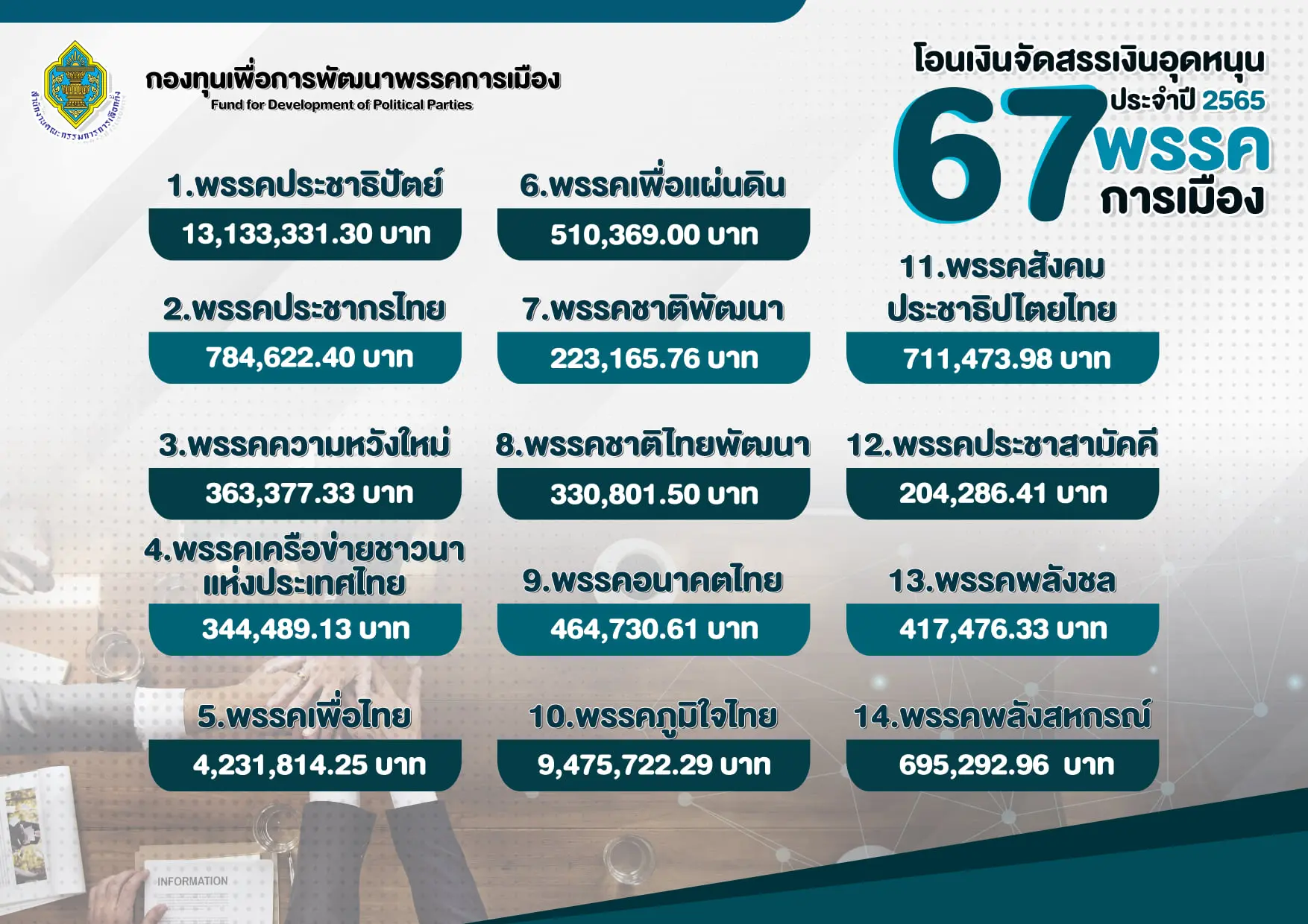 เฟซบุ๊ก กองทุนเพื่อการพัฒนาพรรคการเมือง รายงานว่า สำนักงานคณะกรรมการการเลือกตั้ง โดยกองทุนเพื่อการพัฒนาพรรคการเมือง ขอแจ้งการโอนเงินการจัดสรรเงินอุดหนุนให้แก่พรรคการเมือง ประจำปี 2565 จำนวน 67 พรรคการเมือง