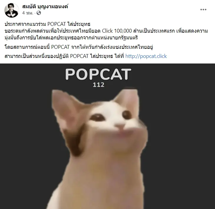 สมบัติ บุญงามอนงค์ หรือ บ.ก.ลายจุด นักกิจกรรมทางการเมือง ได้โพสต์ข้อความผ่านเฟซบุ๊ก สมบัติ บุญงามอนงค์ ชวนคนไทยมาคลิกเกมยอดฮิตอย่าง POPCAT ไปให้ถึงแสนล้านคลิก เพื่อเป็นการแสดงออกจาการเมืองขับไล่พลเอกประยุทธ์ จันทร์โอชา นายกรัฐมนตรีคนปัจจุบัน โดย บก.ลายจุดได้ระบุข้อความเอาไว้ว่า