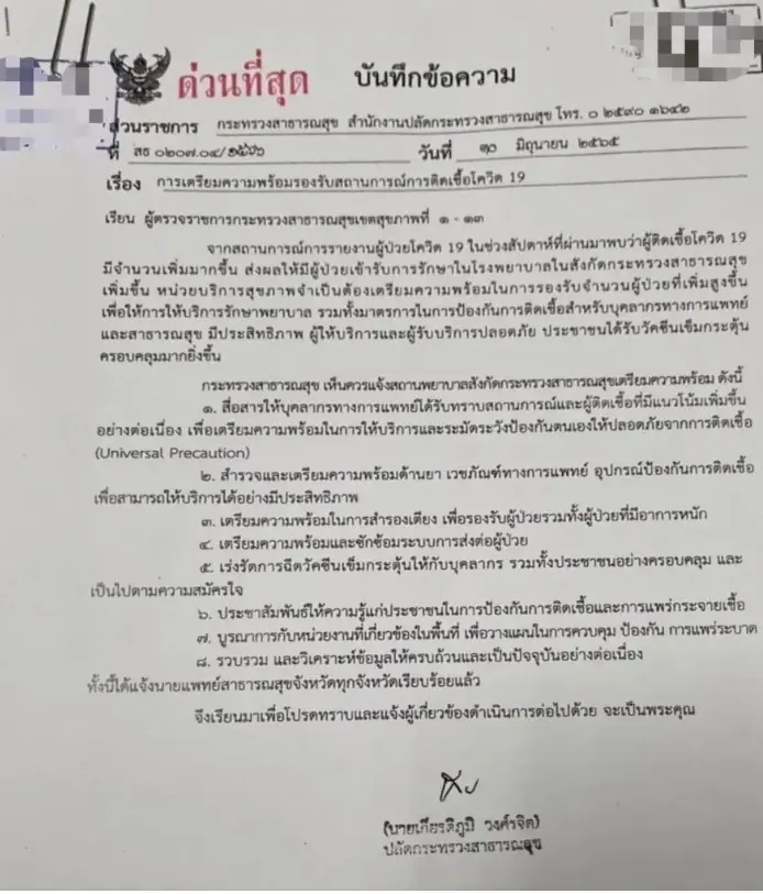 1 สื่อสารให้บุคลากรทางการแพทย์ได้รับทราบสถานการณ์ และผู้ติดเชื้อที่มีแนวโน้มเพิ่มขึ้นอย่างต่อเนื่อง เพื่อเตรียมความพร้อมในการให้บริการและระมัดระวังป้องกันตนเองให้ปลอดภัยจากการติดเชื้อ (Universal Precaution)